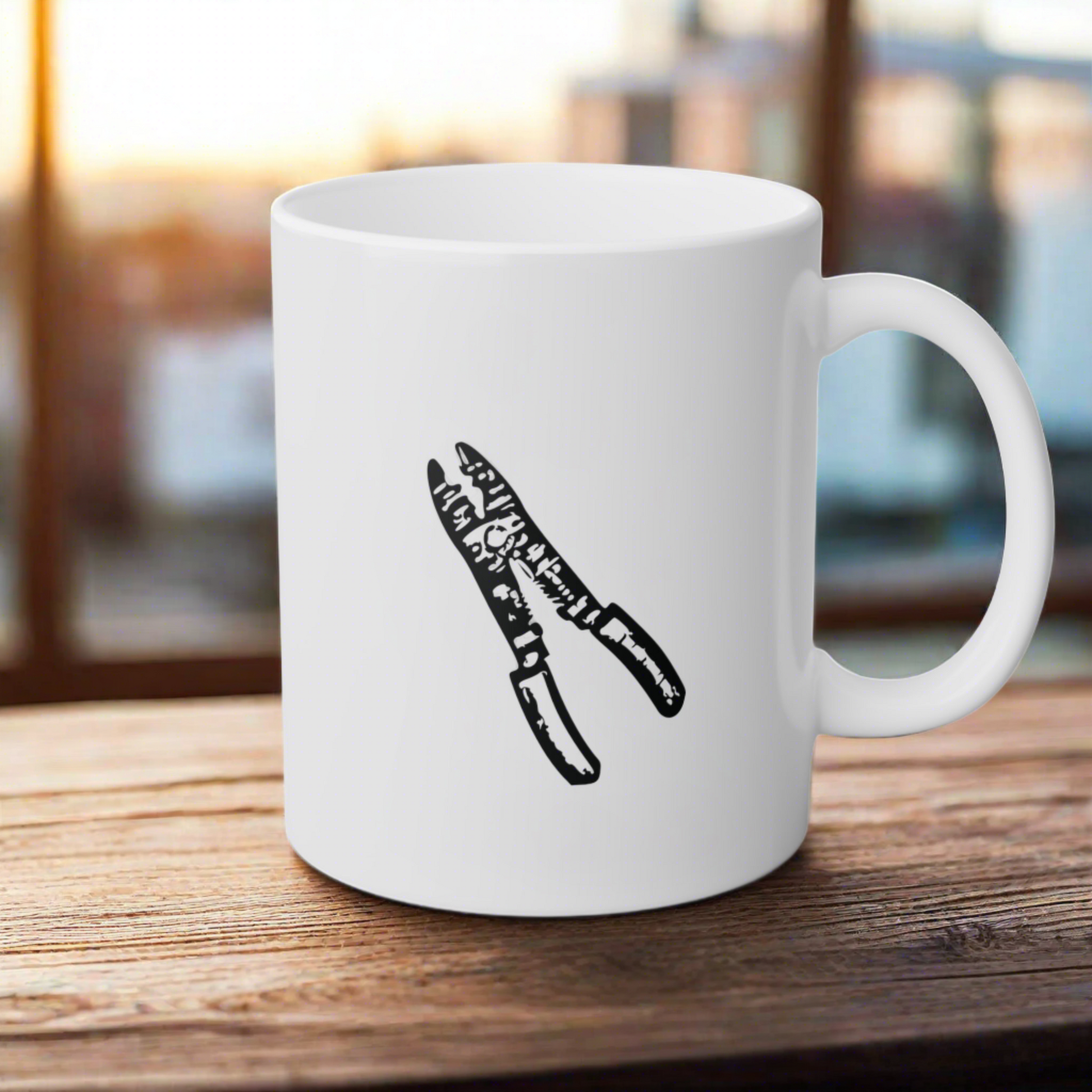 Glossy white ceramic mug with electric work related art.11oz. Unique design. Comfortable C-style handle. Dishwasher safe. Microwave safe. Retains a great look for a long time.